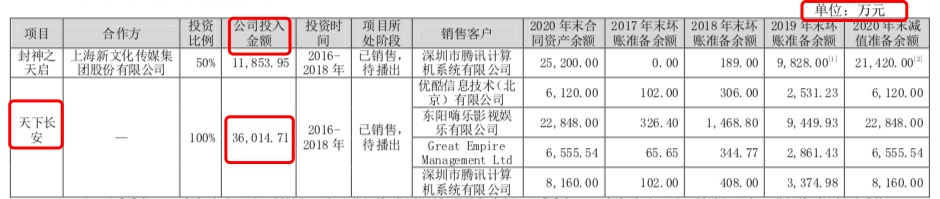 事实上,不仅仅是《天下长安》,公司另一部斥巨资1.19亿元打造的古装剧《封神之天启》亦是遭巨额坏账计提准备,该剧由欢瑞联合上海新文化传媒打造。公司曾在2020年报问询函回复中坦言:“电视剧《封神之天启》因政策原因无法播出,根据退片及播出等概率计提坏账2.14亿元。”