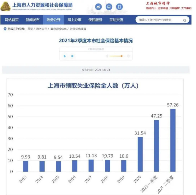 根据上海市人力资源和社会保障局数据,2021年截至3季度末,上海市累计领取失业保险65.7万人。