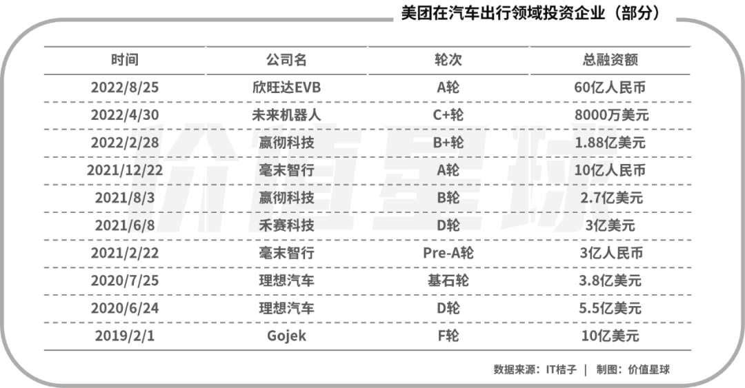 2022年伊始至今,美团已经在汽车出行领域出手3次。2月,美团跟投自动驾驶卡车技术与运营公司嬴彻科技的1.88亿美元B+轮融资;4月,美团领投未来机器人(深圳)有限公司8000万美元的C+轮融资;8月,美团战投领投欣旺达EVB60亿元A轮融资。