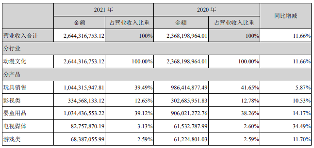 之后,奥飞的财报将动漫玩具与非动漫玩具类整合,2015年的玩具类收入占总营收62.41%,而影视类只占16.3%。一直到2017年,玩具销售收入始终占总营收的50%以上;2021年以前,玩具销售都是奥飞娱乐营收占比最高的业务。