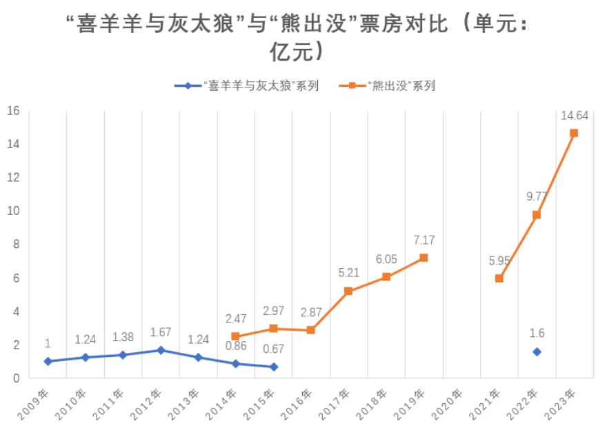 《熊出没》第一部大电影在2014年上映,获得2.47亿票房,而同期上映的《喜羊羊6之飞马奇遇记》,票房只有8619万。除了2020年,熊出没每年稳定输出一部贺岁片,票房一路走高,而喜羊羊在2015年就停止了出品大电影,等到2022年再上映时,已经错过了国产动画电影发展的黄金时期。