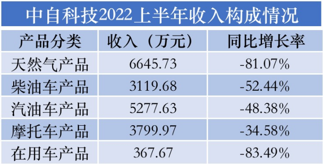 进入2022年,中自科技面对的行业环境更加萎缩。受疫情和宏观经济形势影响,重型商用车整体销量下降且报告期内天然气价格大幅上涨、柴油车国五产品冲量抢装,今年1-6月公司所有产品线收入均大幅下降,其中天然气产品、柴油车产品、汽油车产品、摩托车产品、在用车产品分别同比减少81.07%、52.44%、48.38%、34.58%和83.49%。