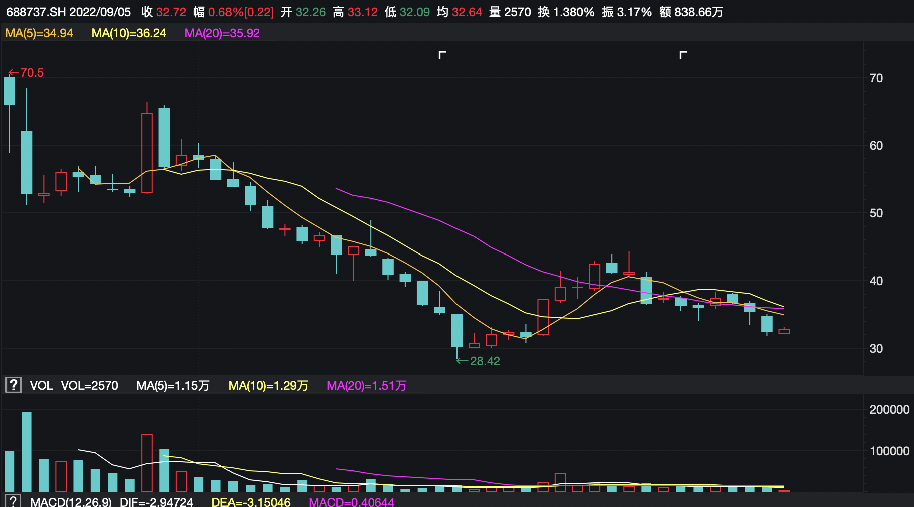 更糟糕的是,上市即巅峰的中自科技此后股价连续震荡下行,今年4月28日一度下挫至最低28.42元/股,相较发行价跌去近六成。此后虽有反弹,但截至9月5日,仍只报收32.72元/股,股价不及发行价的一半。
