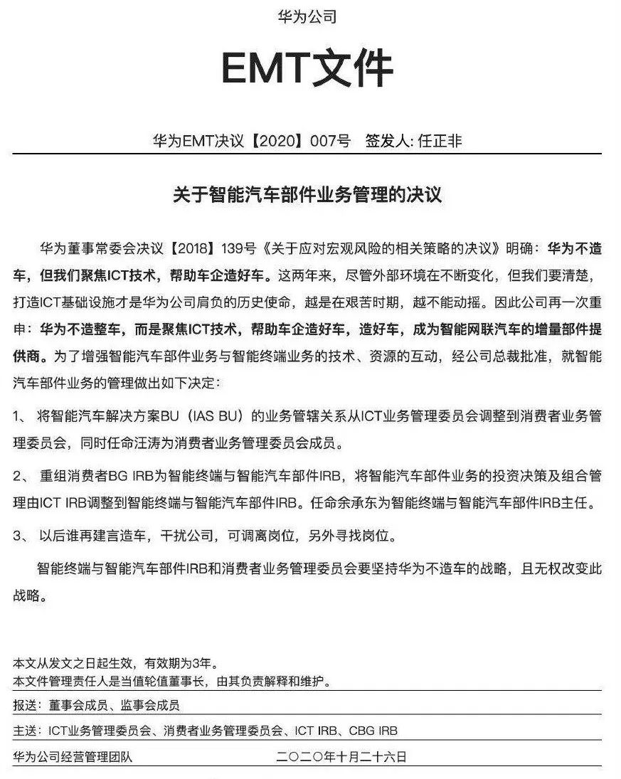 为彰显决心,华为2020年发布了一份文件,提及了代号为【2018】139号的决议,内容就包括“华为不造整车,聚焦ICT技术,帮助车企造好车”,还以严厉措辞表示“以后谁再建言造车,干扰公司,可调离岗位,另外寻找岗位。”