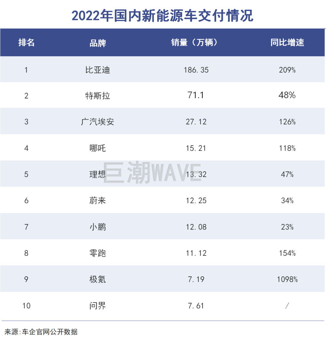 根据各家车企公开数据,2022年全年比亚迪在国内交付新能源车186.35万辆,特斯拉交付新能源车71.7万辆,广汽埃安交付新能源车27.11万辆,而曾经位居造车新势力第一梯队的“蔚小理”则冲劲不足,被哪吒汽车所超越。
