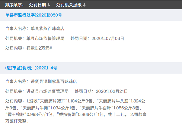 钛媒体APP在中国市场监管行政处罚文书网上搜索“紫燕百味鸡”,显示有2家门店的处罚信息。2020年7月,单县市场监督管局对单县紫燕百味鸡店未明码标价进行了处罚。同年2月,进贤县市场监督管理局对进贤县温圳紫燕百味鸡店预包装食品无生产日期进行了处罚。