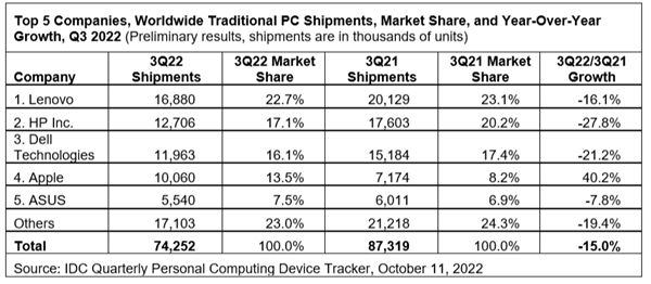 转眼间2022年已经过去了三个季度,全球经济复苏步伐加速,但却不是每个行业都高兴得起来。近期IDC公布了2022年第三季度全球PC销量,本来就进入衰落期的PC行业,迎来了更为严酷的寒冬。