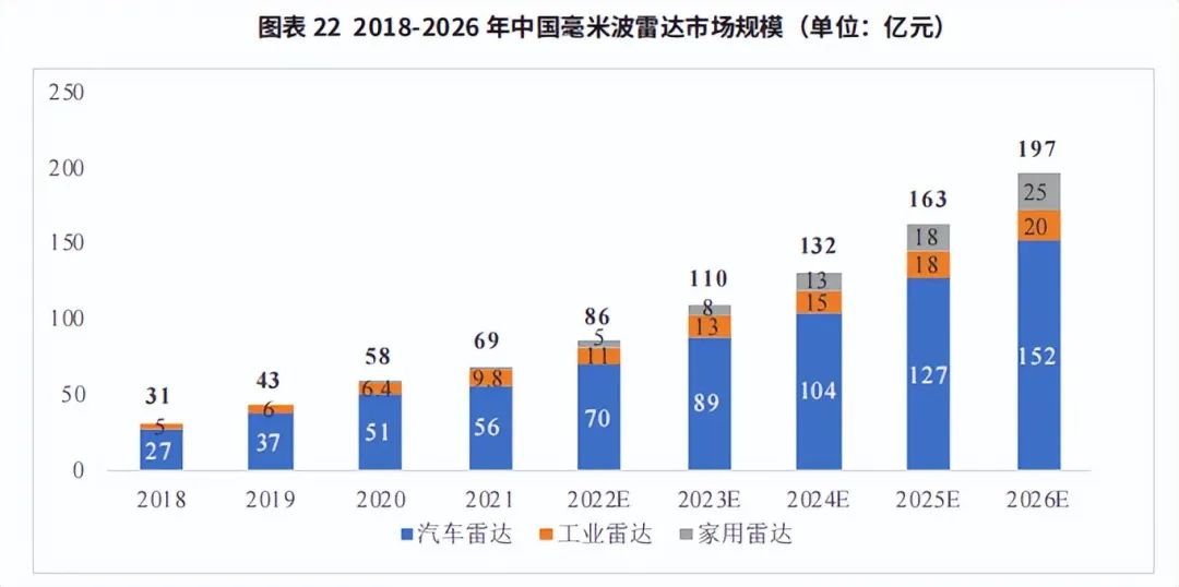 未来,随着我国汽车、交通、安防、工业、家居、康养等产业的智能化升级不断推进,毫米波雷达的应用将进一步扩大。预计到2026年中国毫米波雷达市场规模将达到197亿元,年复合增长率为23.3%。