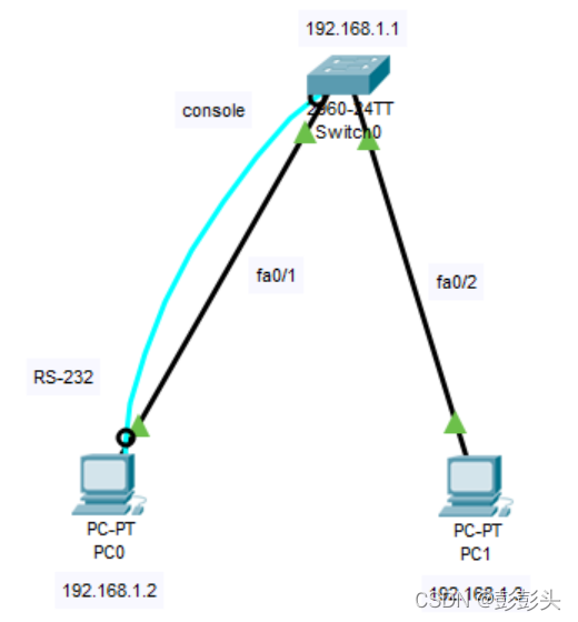 - 添加1台Switch_2960交换机、2台PC:PC0、PC1