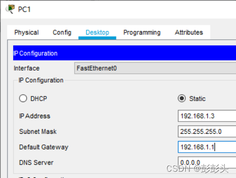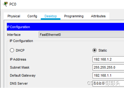 3.点击PC,分别配置PC0、PC1的IP地址/子网掩码