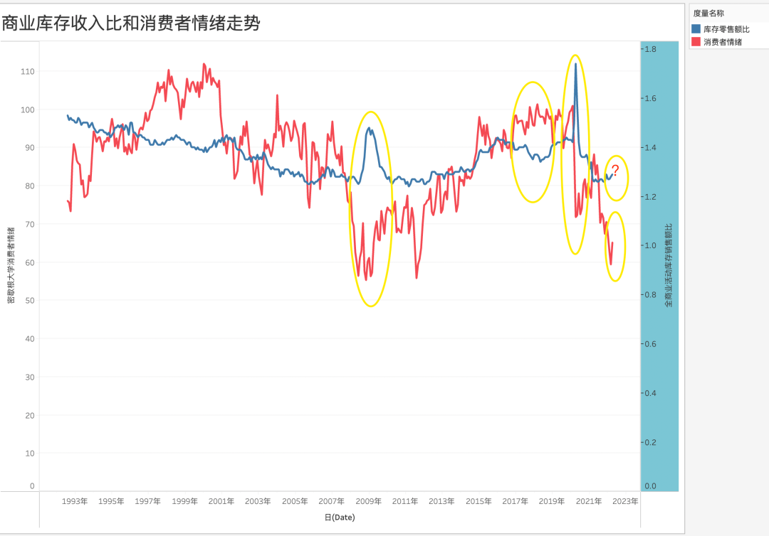 我们引入了密歇根大学的消费者情绪和美国商业活动库存占营收比两组数据进行对比,在上图中我们标注了过去十余年内关键节点上两组数据的走势情况,如2008年,2018年,2020年,两组数据都呈现了明显的负相关性,也就是消费者情绪低沉,库存占比陡然上升,消费者情绪高涨,库存压力缓解,2022年之后,消费者情绪一路下滑,与此相伴的是库存占营收比仍然保持了比较稳定的态势。