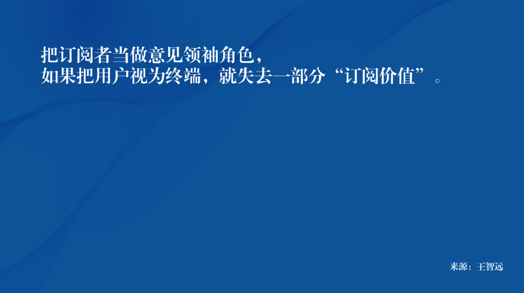 换言之,应该把订阅者当做意见领袖(KeyOpinionLeader)角色,如果把用户视为终端,就失去一部分“订阅价值”。