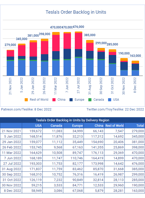 Troy Teslike 统计数据表明,截止 12 月 8 日,特斯拉全球订单积压量从 7 月的 47.6 万暴跌至 16.3 万。按照这一产能估计,这意味着仅需 40 天就能将剩余订单全部产消耗光。