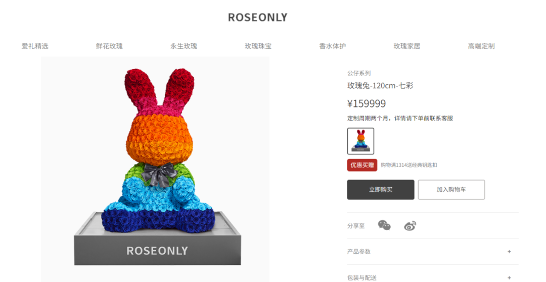 这还不是最贵的,ROSEONLY有一款需定制的永生玫瑰,选择约66朵厄瓜多尔永生玫瑰,并可以定制私人专属图案,定制周期需要2至3个月,售价39999元,更有一款由约900朵厄瓜多尔玫瑰制作成的、高120厘米的玫瑰兔,售价159999元。