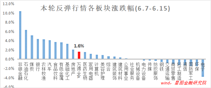 大盘的本轮行情始于4月27日,至6月15日,全A指数累计反弹18.05%,其中,上证指数、深证成指、创业板指和科创50指数分别累计反弹14.52%、18.92%、19.74%和22.42%,反弹幅度已较为充分。