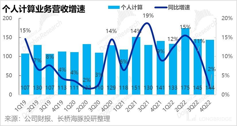 分项业务板块来看,本季度生产力板块和智慧云板块的经营利润绝对值仍在增长(无论环比同比),主要还是个人计算板块的经营利润绝对值减少,拖累了公司整体利润。