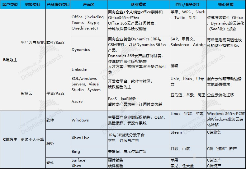 - 更多个人计算业务,如 C 端产品 Surface、Xbox 等硬件、游戏业务、Bing 搜索,包括 Windows 业务在内,更多是微软在移动时代博弈失败的遗留资产,三大业务中战略地位最低。