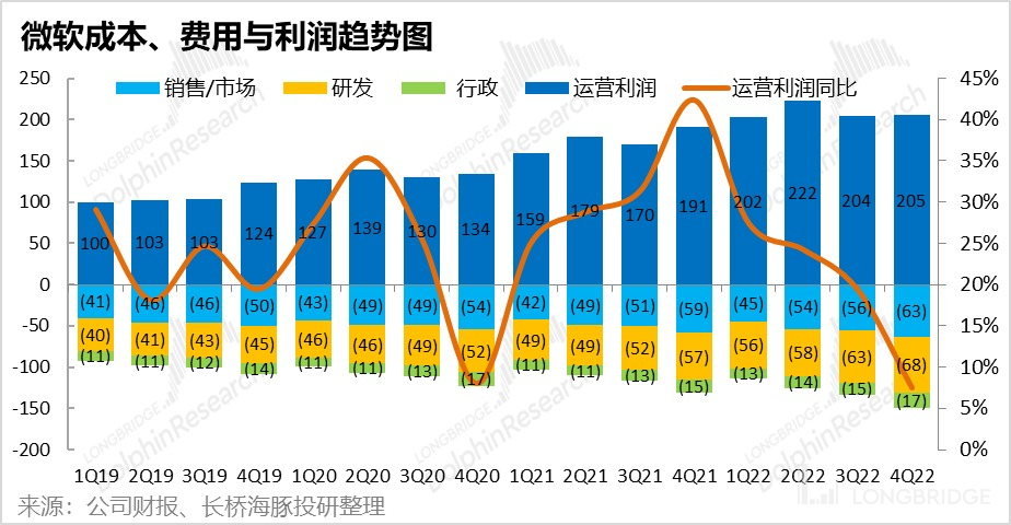 不过,在通胀大背景下,公司的运营费用看来短期内不会缩窄,仍会保持在 148 亿-149 亿美元之间,与本季度基本一致。因此,下季度微软有望实现经营利润 213 亿元,经营利润率相较本季也会略微改善到 40.2%。
