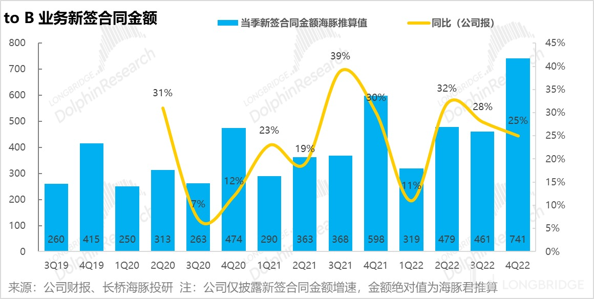 在合同余额提速增长的同时,微软本季新签 2B 合同金额达到了 741 亿美元,虽然同比增速略有下滑,但更多是因为基数增长的原因。本季新签订单金额的绝对值同比多增了 143 亿元,再创新高。
