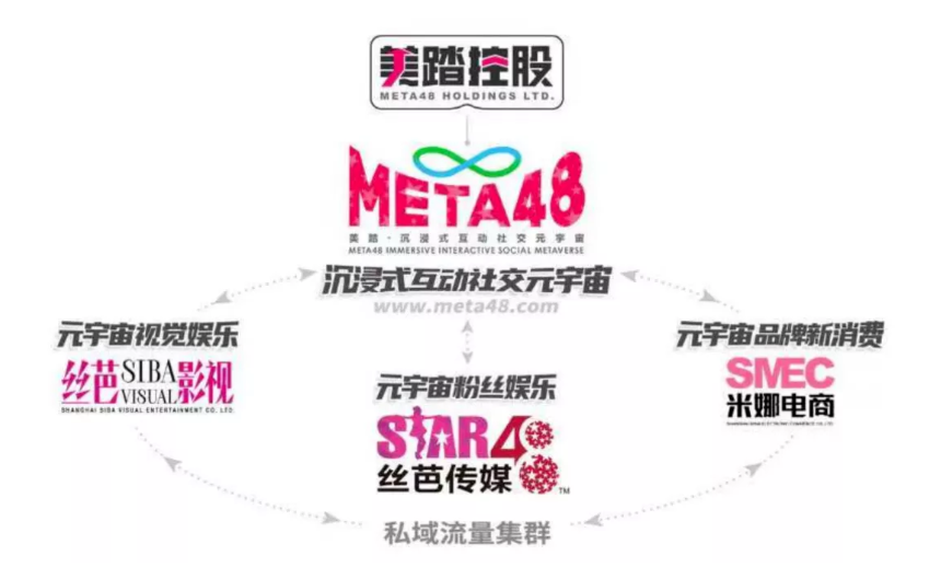 6月10日,丝芭传媒官宣,公司业务与企业架构将重组,其控股公司更名为美踏控股,核心业务将转型为面向WEB3.0和XR互联网时代的沉浸式互动社交元宇宙——美踏元宇宙。META48旗下核心业务共分三块:元宇宙视觉娱乐、元宇宙粉丝娱乐与元宇宙品牌新消费,分别对应着丝芭影视、丝芭传媒与米娜电商。