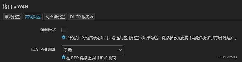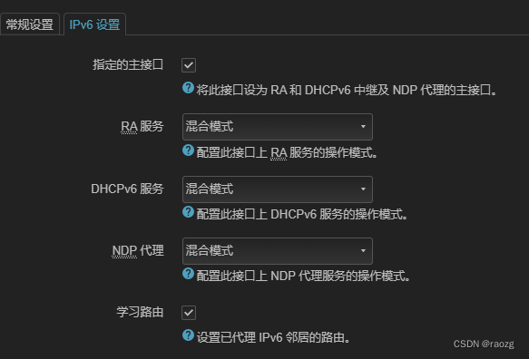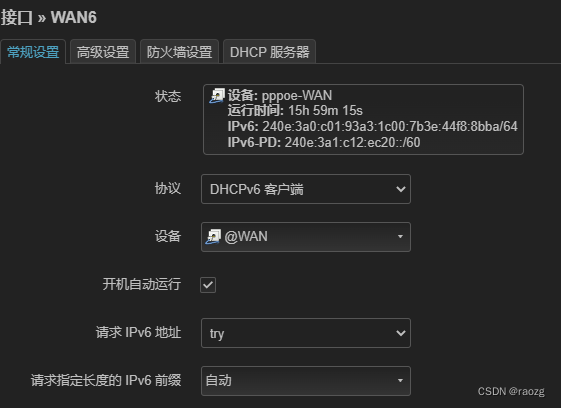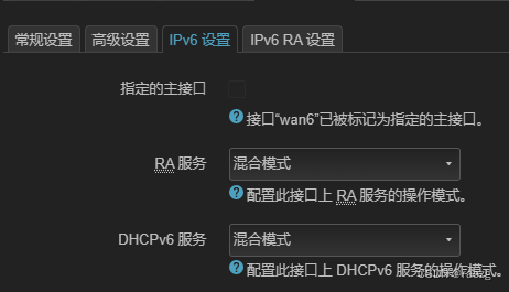 其他选项默认即可(若没有此选项,需要点击创建按钮)。此处DHCPv6服务选禁用(选中继也可以,似乎没有影响),这主要是为了让LAN接口作为主DHCPv6服务。正常设置后,WAN6获取到IPv6会得到