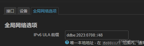 这里和其他网友IPv6设置不同,主要是为了指定内部IPv6网关和v6DNS。19大版本之后的openwrt不再需要设置dnsmaq中的IPv6支持。 首先,配置IPv6 ULA前缀,启动本地局部IPv6网络。这里有其他网友配置说明说需要取消,但实际上取消后,win10及安卓手机可以获得外网的IPv6地址,却无法获取到自动推送的IPv6 DNS服务器。使用本地的ULA网络后,win10及安卓手机可以同时获得一个本地IPv6地址、网关及本地v6 DNS(openwrt的LAN接口地址)