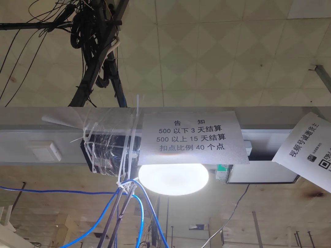 根据柜台上张贴的告示,主播帮助货主卖翡翠商品,成交后的抽成比例为40%,结算周期根据商品价格分为3天内或15天内。(结算周期略有不同,但扣点比例均为40个点。)