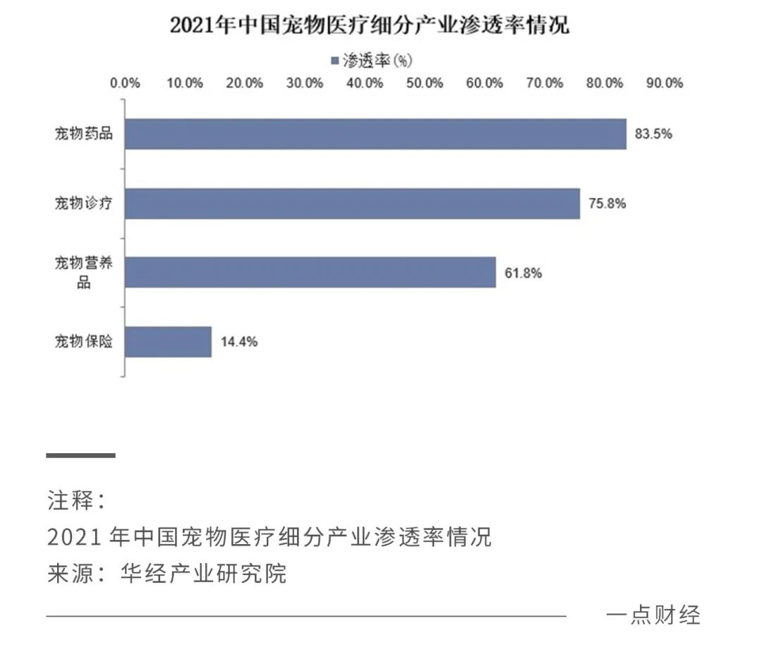 目前来看,宠物医疗上游产业为药品疫苗、宠物医疗设备和医疗耗材等业务,下游有医疗金融等衍生服务。近几年,中国几家知名保险公司都推出了宠物医疗保险,保费高一点的能达到几千甚至上万元。眼下宠物保险的产业渗透率仅为14.4%,未来还有很大想象空间。