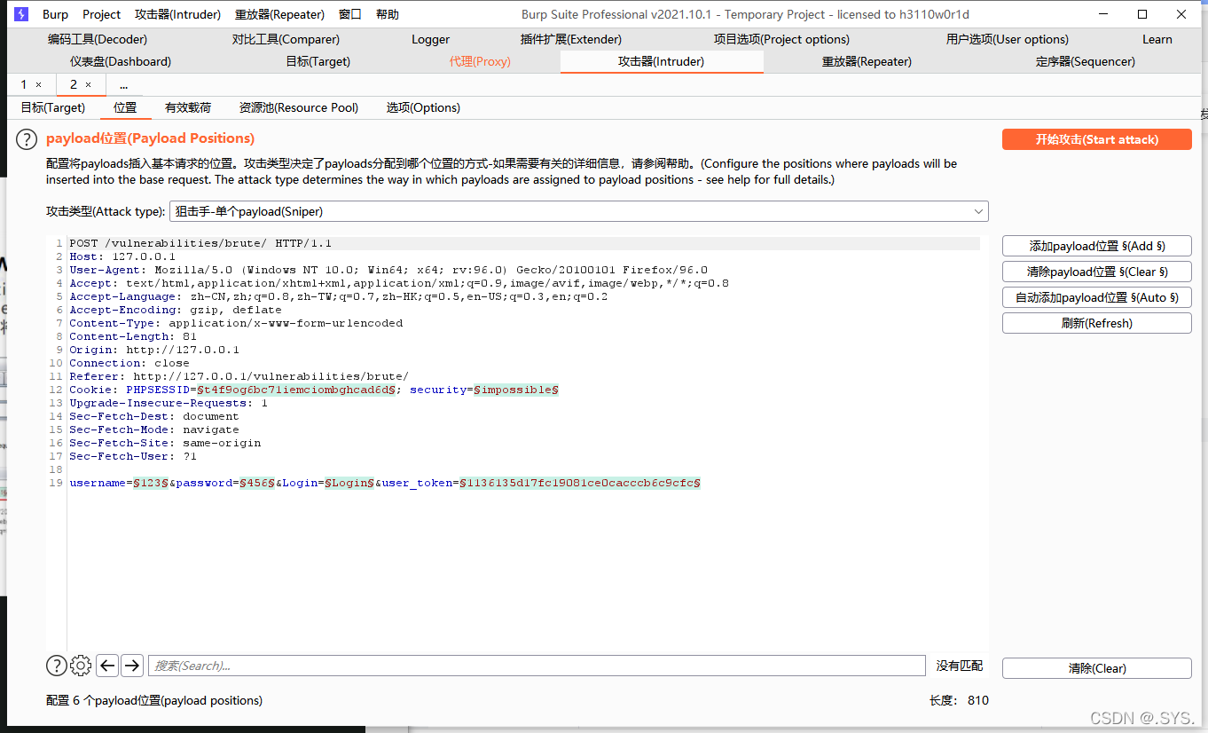Intruder在原始请求数据的基础.上,通过修改各种请求参数,以获取不同的请求应答。每一-次请求中,Intruder通常 会携带-一个或多个有效攻击载荷,在不同的位置进行攻击重放,通过应答数据的比对分析来获得需要的特征数据。