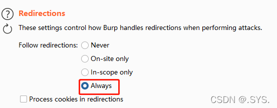 ** 在Redirections处设置”Follow Redirections“为”always“(总是重定向)。**