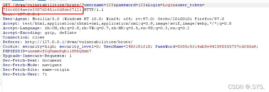 步骤1:开启BurpSuite拦截功能,并在DVWA网站的暴力破解(Brute Force)模块登录处任意输入用户名和密码,点击login按钮,此时BurpSuite Proxy会拦截到HTTP请求报文。与Low级别不同的是,High级别拦截到的HTTP请求报文中含有user_token字段。