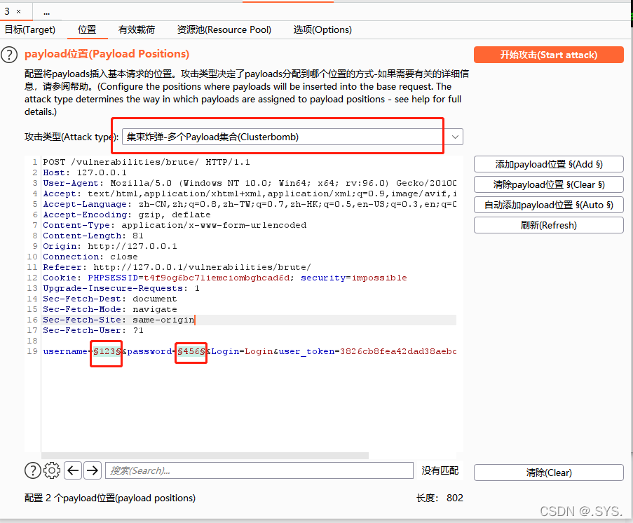 步骤5:进入选项卡Intruder-> Positions,先点击"Clear s"按钮清空默认选择的位置,然后依次选中"username="和"password="后面的值,并点击"Add g"按钮指定爆破位置,同时将Attack type设置为"Cluster bomb"(集束炸弹模式)。