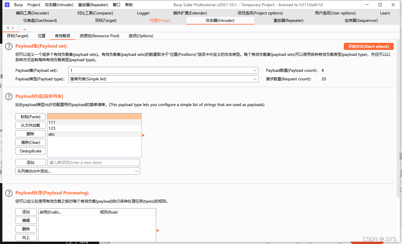 步骤4:进入选项卡Intruder->Payloads,设置2个payload set(有效载荷集):