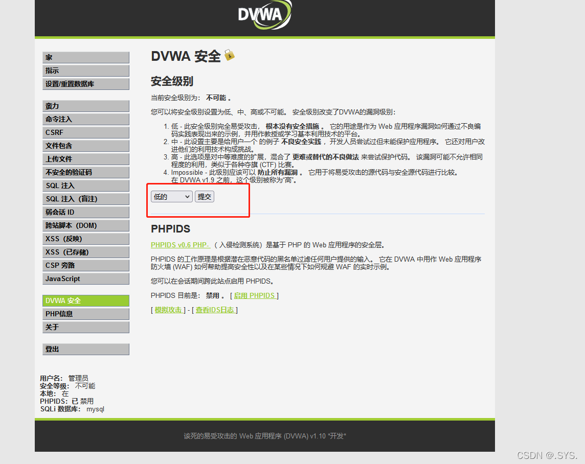 步骤1:进入DVWA,将安全等级调至Low,并进入网站暴力破解模块