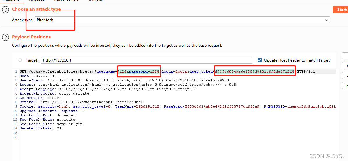 步骤3:进入选项卡Intruder->Positions,按如下方式指定爆破位置,同时将Attack type设置为“Pitchfork”(草叉模式) 。
