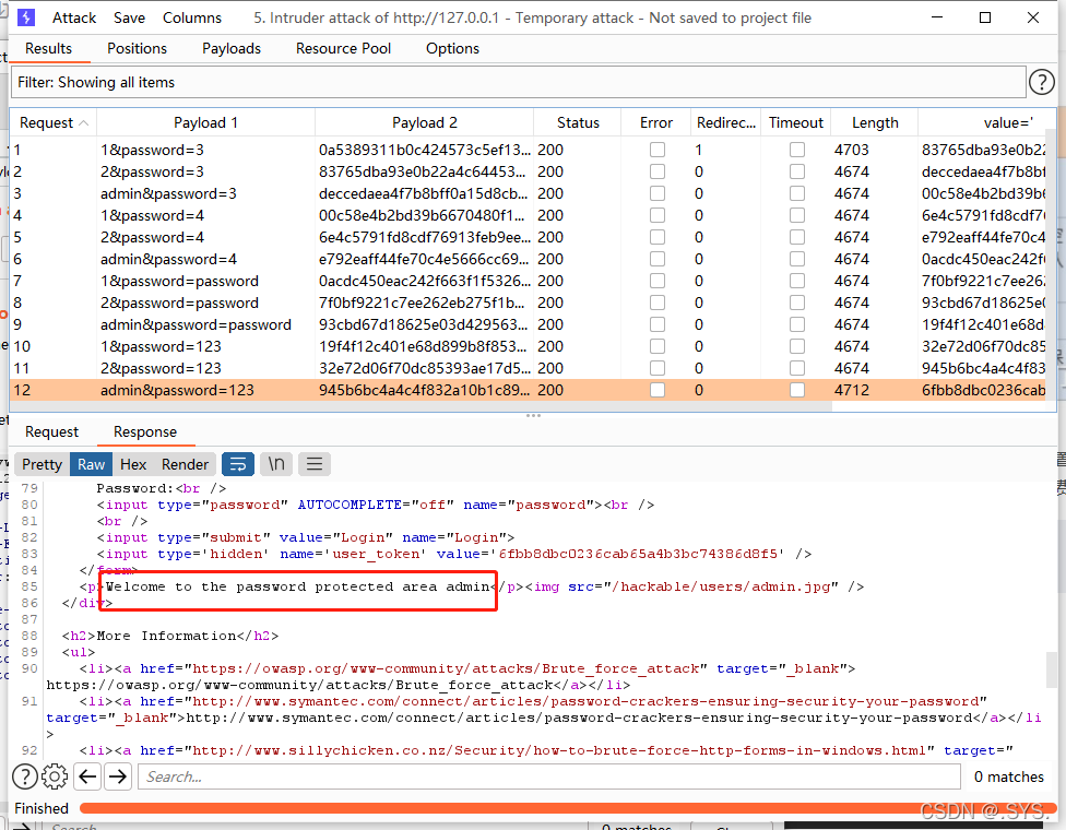 步骤7:点击右上方的”Start attack“按钮执行爆破攻击,并观察结果。通过请求报文的长度或应答报文的内容判断,正确用户名和密码为admin/password