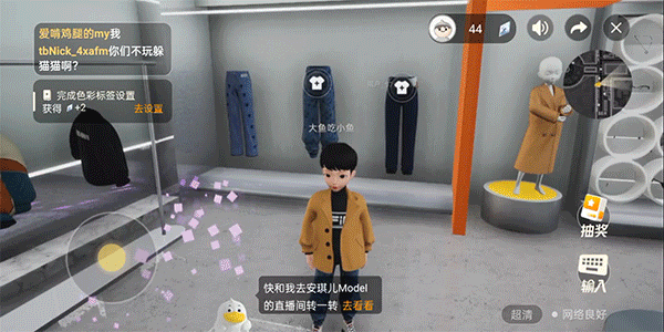 在用户侧,用户除了可以试穿衣服外,还可以收集水晶、抽奖(店铺优惠券、满减红包、虚拟服饰等),还可以放烟花,显然,「未来城」已经有了一定的交互性。