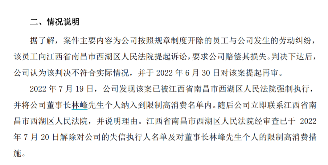 7月25日,正邦科技针对此事发布公告称,此次涉及案件为劳工纠纷。在7月19日发现董事长被限消后,公司已与法院联系并说明理由。7月20日,法院经审查已解除了对正邦科技失信执行人名单及对董事长林峰的限制高消费措施。