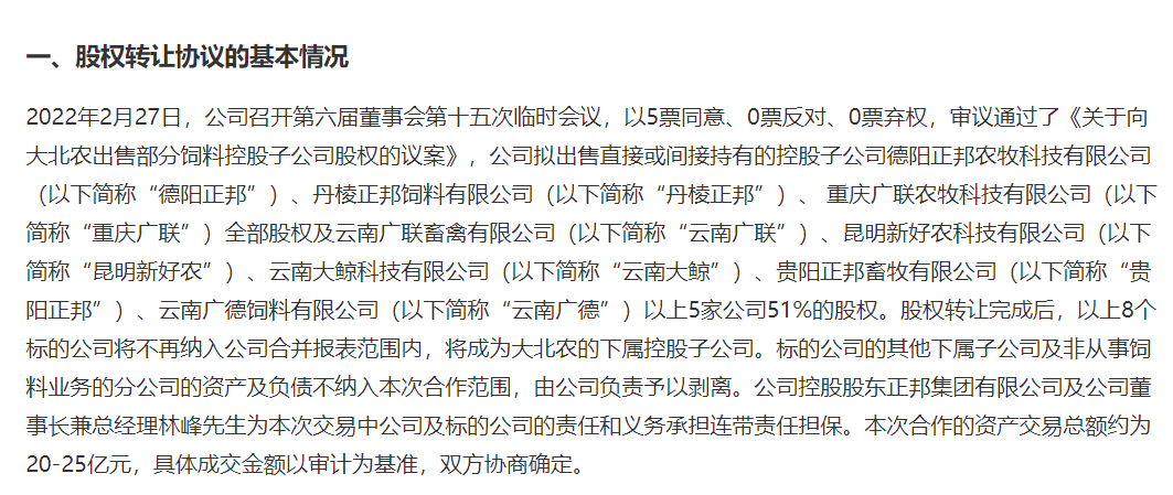 其实这些举措,正邦科技已经在进行。比如在今年2月,正邦科技大股东正邦集团就向大北农出售部分饲料业务,近日正邦科技又与厦门建发股份签署战略合作,金额达到60亿元。