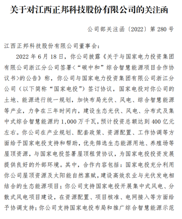 在公告后,深交所就立刻要求正邦科技结合公司主营业务,详细说明与国家电投开展本次合作的背景、目的与具体合作方式,与公司现阶段发展状况以及未来发展规划是否匹配。