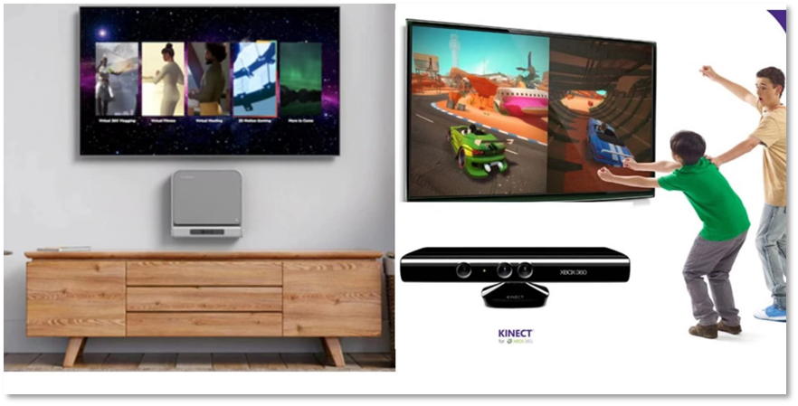 2010年,微软专门为Xbox体感游戏推出了360度体感周边外设Kinect,原理也是通过内置摄像头捕捉用户动作,再把动作语言转换为游戏行为控制,同样是连接电视或PC屏幕,同样是无穿戴。Kinect一推出即爆款,用户不但把它当体感游戏机用,还拿它来辅助运动健身。