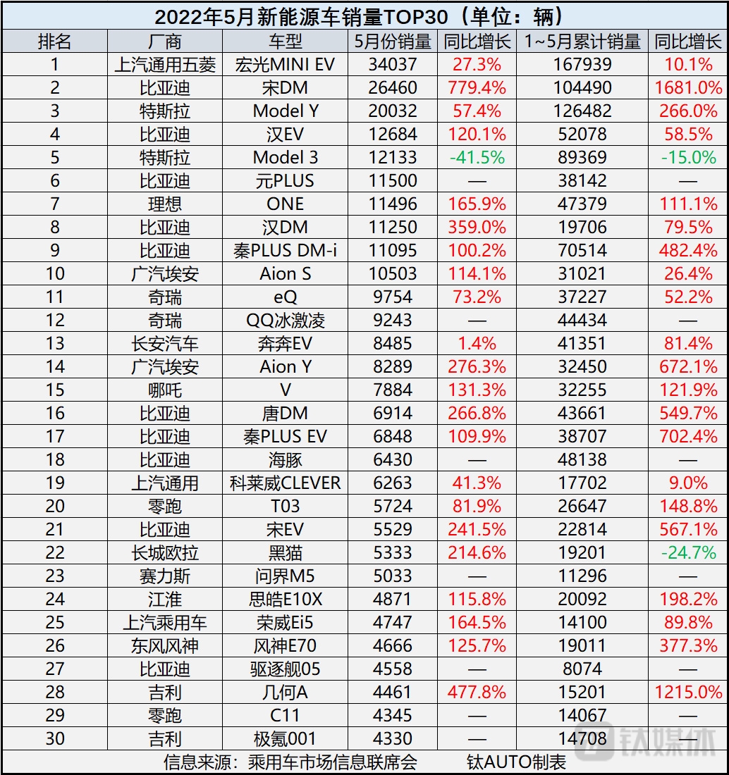 5月宏光MINI EV排名第一,销量为3.4万辆,同比上升27.3%。比亚迪宋DM以2.6万辆成绩稳坐亚军位置。其次销量前十里,比亚迪占5位,除比亚迪宋DM外,比亚迪汉EV、元PLUS、比亚迪汉DM、比亚迪秦PLUS DM-i则分别售出1.3万辆、1.2万辆、1.12万辆和1.1万辆,分别排名第4、6、8和9名。比亚迪唐DM、比亚迪秦PLUS EV、比亚迪海豚则跌出前十。特斯拉Model Y、Model 3销量回升,分别售出2万辆和1.2万辆,排名第3和第 5名,但Model 3仍同比下滑41.5%,是榜单中唯一同比下滑车型。