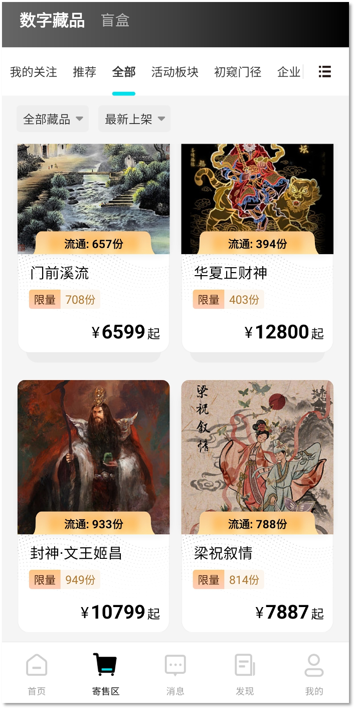相较诸如鲸探等在意监管要求的数藏平台,十八收藏们大胆开放了寄售市场——一种打了擦边球的类二级市场,平台尽管没有明面上提供行有行情、指数特征的撮合交易市场,但允许用户间相互买卖彼此手中的藏品,以此带来流动性。
