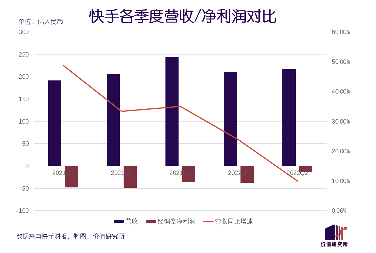 不过价值研究所倒认为,在中概股一片惨淡,阿里、腾讯等互联网巨头纷纷折戟的二季度,快手这份成绩单其实不乏亮点——特别是国内业务的净利润转正,显示了降本增效策略的成果。有亮点也有不足,长期发展战略面临挑战,或许才是对快手二季度报最中肯的评价。