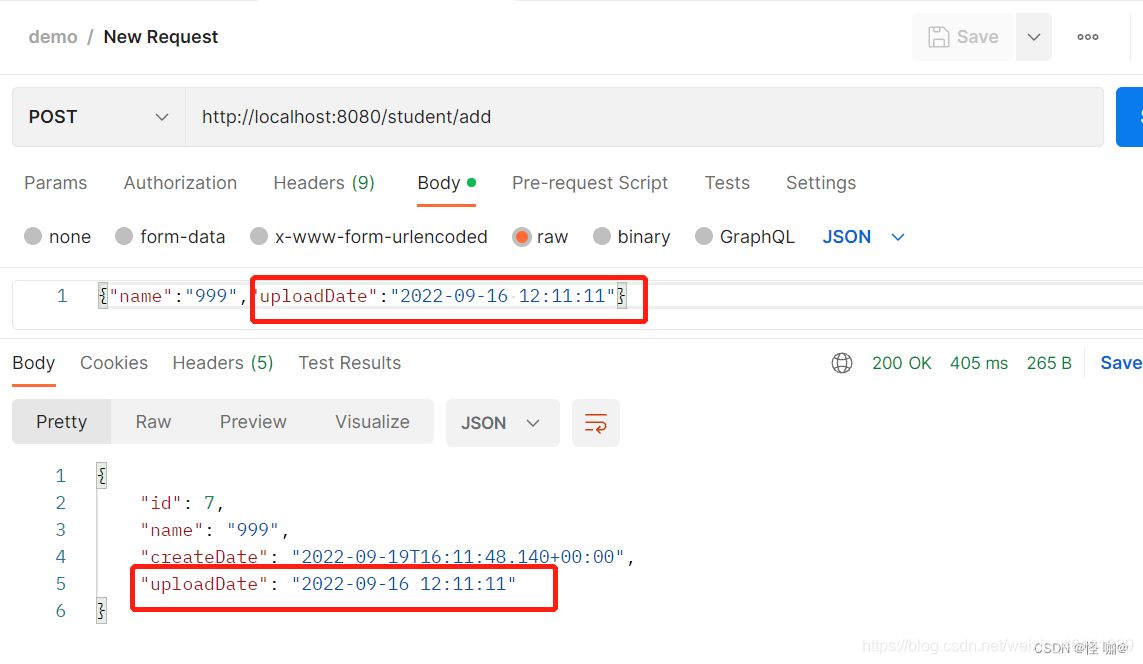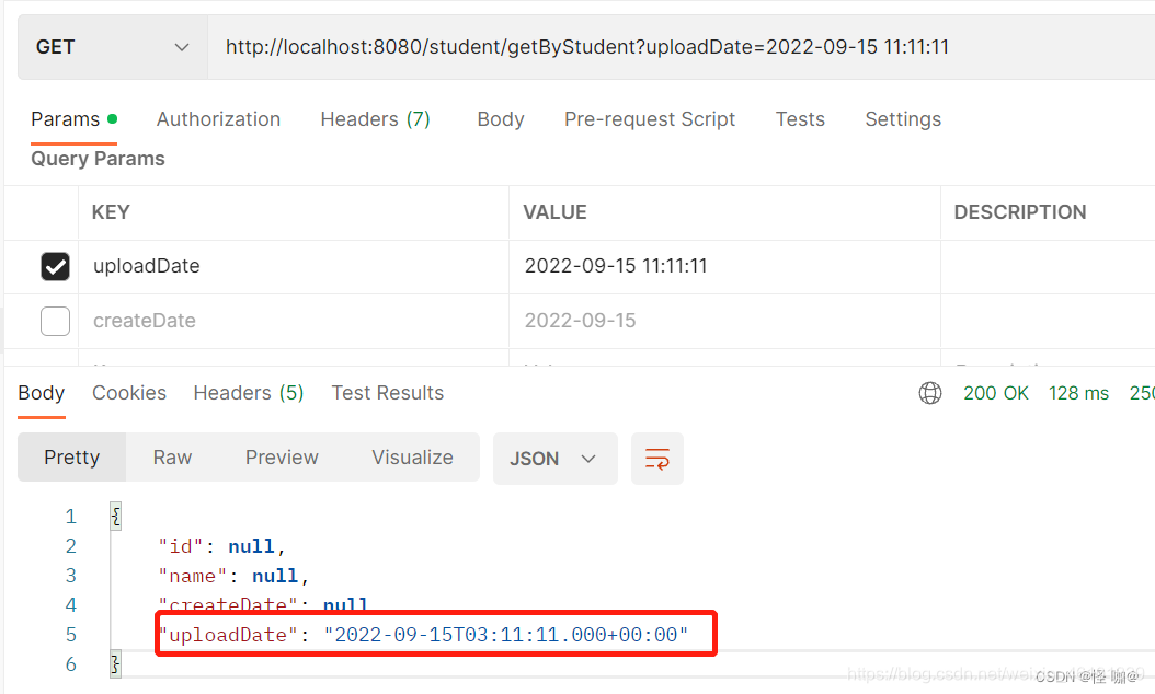 @RequestMapping("student")@RestControllerpublicclassStudentController{@AutowiredprivateStudentService studentService;@PostMapping("/add")publicStudentadd(@RequestBodyStudent student){// 前端假如要是传yyyy-MM-dd不传时分秒,会按照UTC世界时间传,但是后端以Date类型去接参,会将时间转换成当前时区的时间System.out.println(student.getUploadDate());