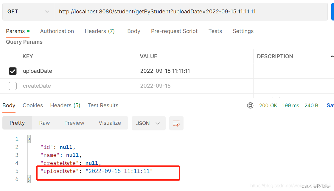 注意前端传的uploadDate只传了年月日,到数据库也会自动补齐时分秒,而且补的还是8点。