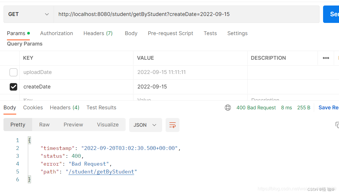 yyyy-MM-dd格式,假如传yyyy-MM-dd HH:mm:ss或者yyyy/MM/dd是都会报400错误的! - 假如使用的mysql的