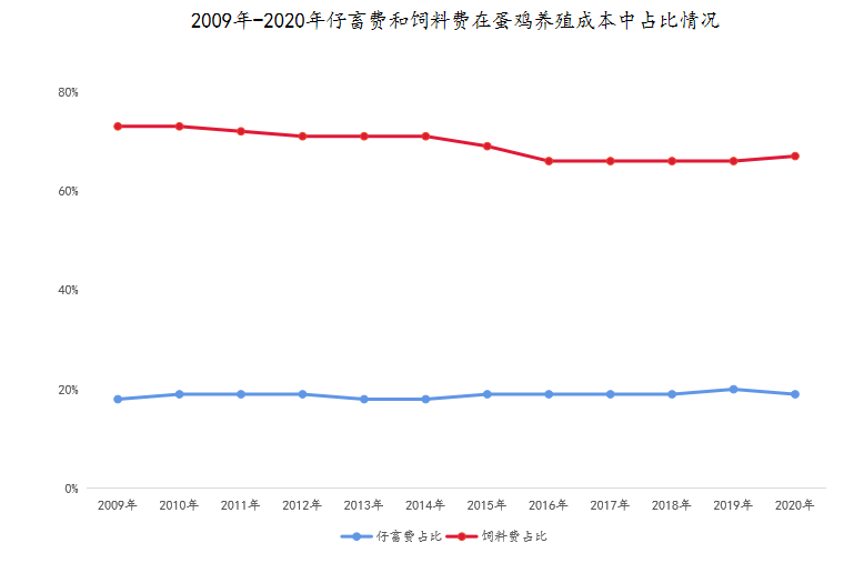 据《全国农产品成本收益资料汇编》,将禽蛋生产总成本分为生产成本与土地成本,生产成本分为物质与服务费用和人工成本两项,再将物质与服务费用细分为多项,其中占比最高的两项为仔畜费用及饲料费用。