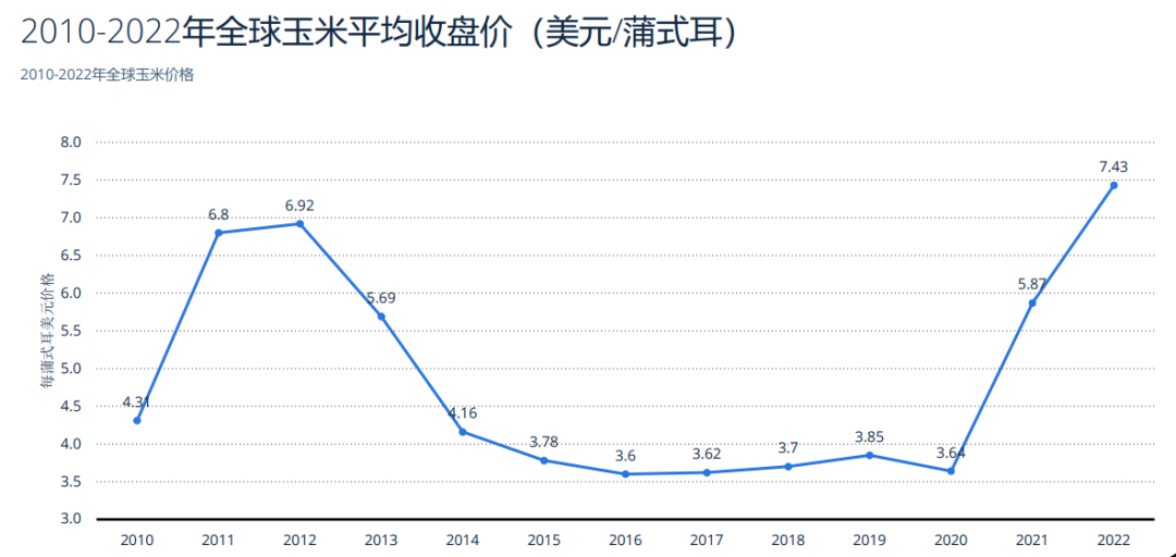 产量的不及预期,也让去年全球大宗农产品价格持续上涨。以玉米价格为例,其收盘价从2021年的5.87美元/蒲式耳上涨到2022年的7.43美元/蒲式耳。