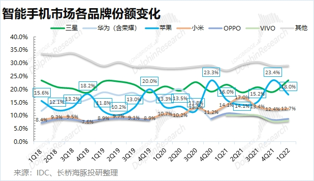 那在下滑的智能手机市场中,各品牌厂商有没有结构性机会呢?从全球前五大手机品牌的份额看,2022年一季度仅有三星和苹果的份额同比上升,而国内三家安卓厂商的份额都有较大的下滑。